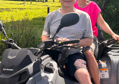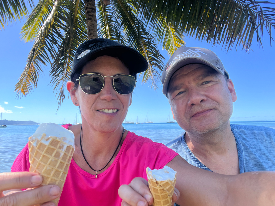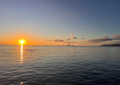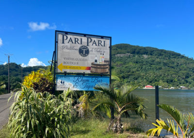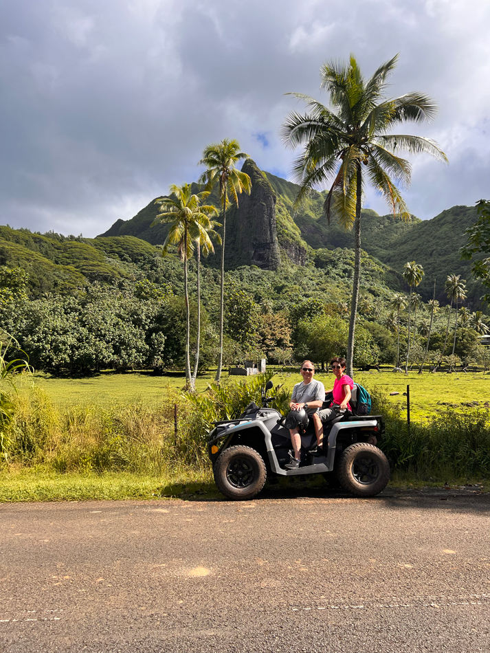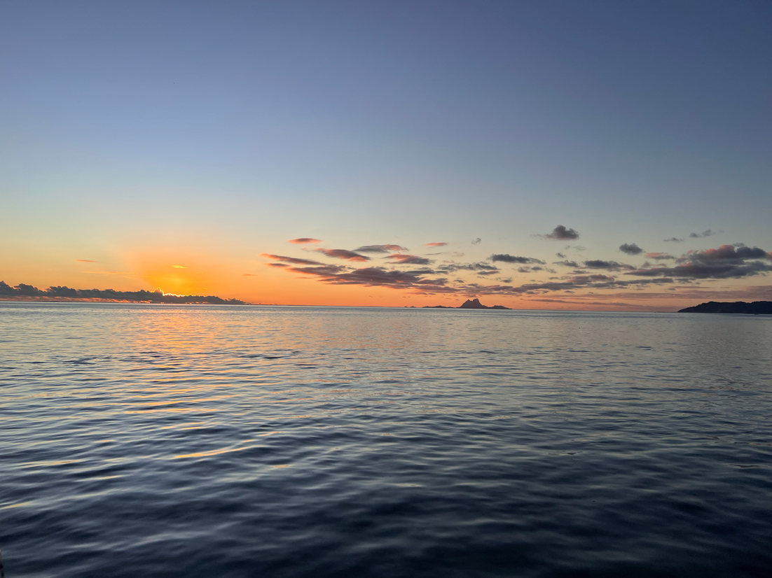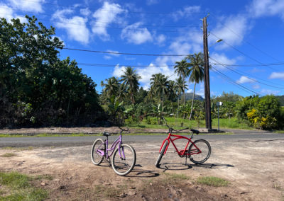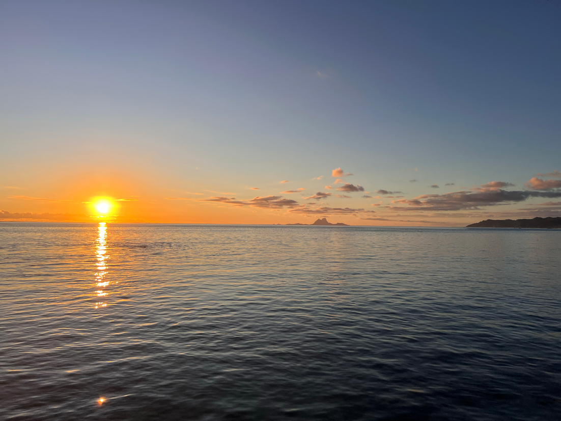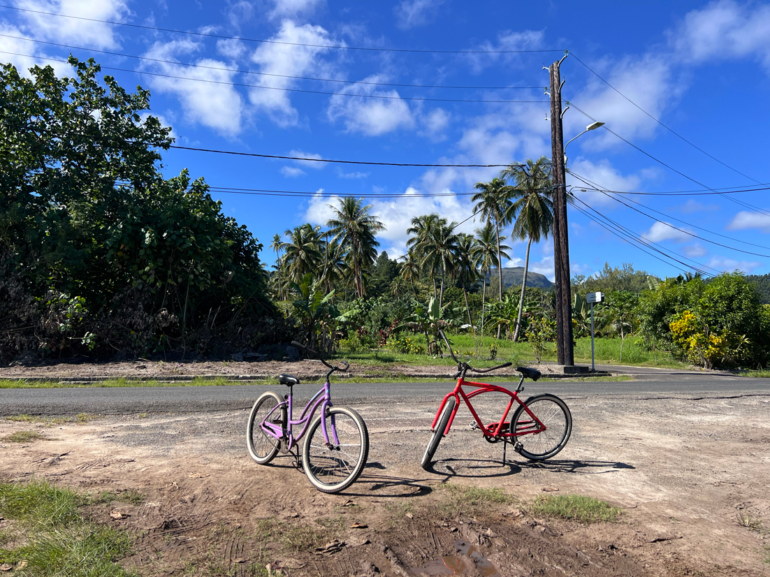 Magnifiques couchers de soleil. Excursion à Tahaa avec ARE Tour, distillerie Pari Pari, déjeuner sur un motu, visite d’une vanilleraie et show coco. Balade à vélo jusqu’à Uturoa et journée en quad avec Céline et sa fille.